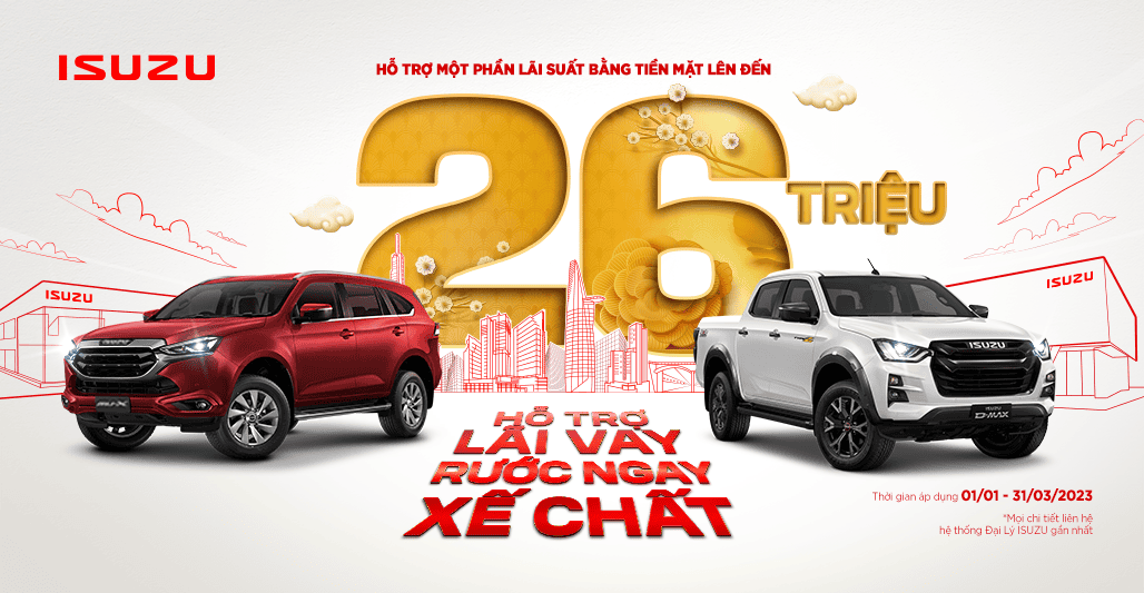 Tưng bừng đón xuân Quý Mão 2023, từ 01/01 – 31/03/2023 hệ thống Đại lý Isuzu Việt Nam triển khai chương trình hỗ trợ lãi suất bằng tiền mặt lên đến 26 triệu đồng cho khách hàng mua xe All New D-MAX và mu-X.